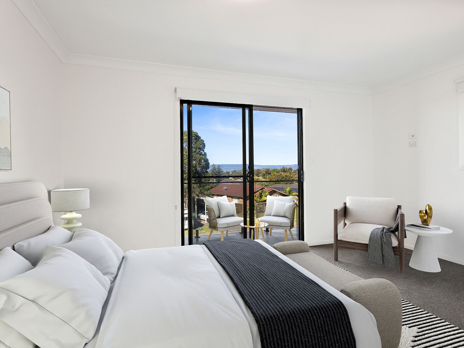 The property features three generously sized bedrooms with the master bedroom offering a walk-in robe, ensuite and private balcony capturing stunning lake views. The home also includes an open-plan living and dining area, a second lounge space and a modern kitchen fitted with quality 600mm appliances, 20mm stone benchtops and a breakfast bar as well as a sought-after rear facing north aspect.